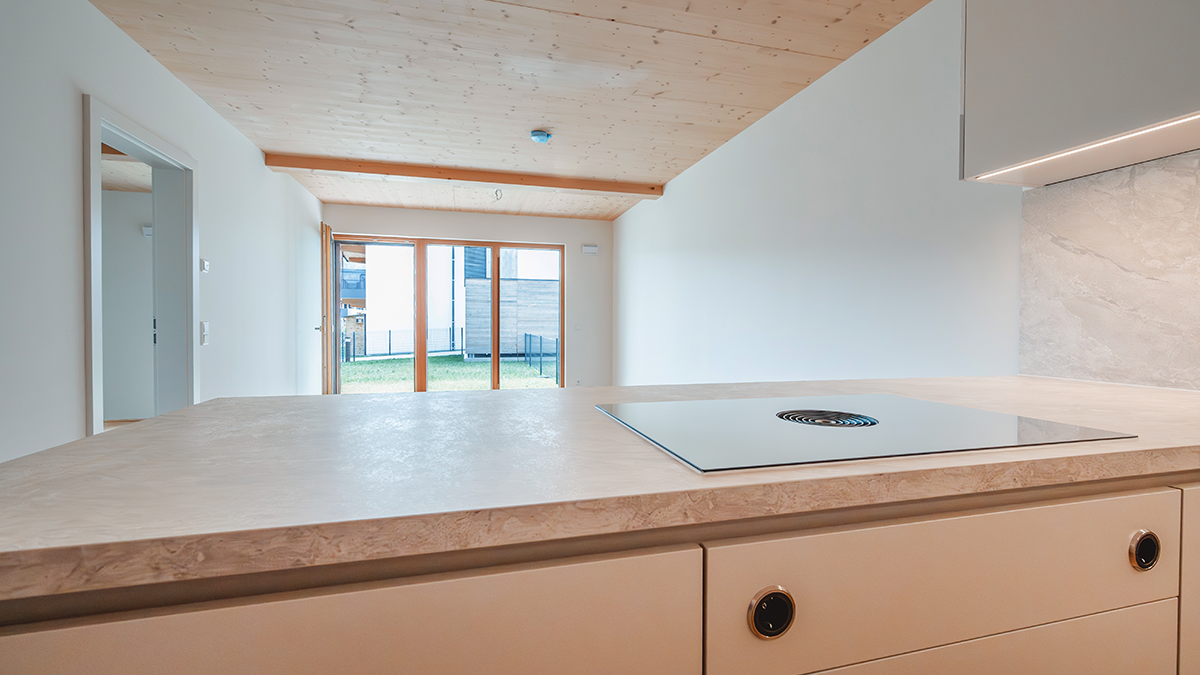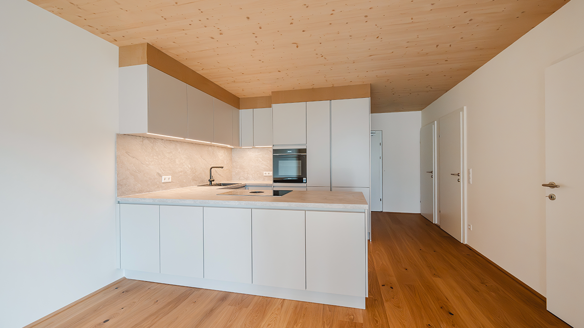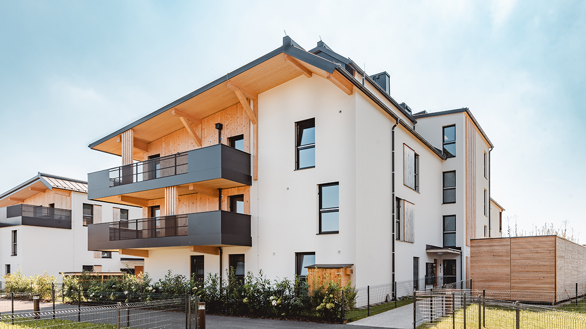 Hier entstand Österreichs erster Vollholz-Wohnbau aus PEFC-zertifizierter Forstwirtschaft mit insgesamt 70 Wohneinheiten – davon 60 Eigentumswohnungen und 10 Mietwohnungen mit Wohnflächen von ca. 52 m² bis 110 m².